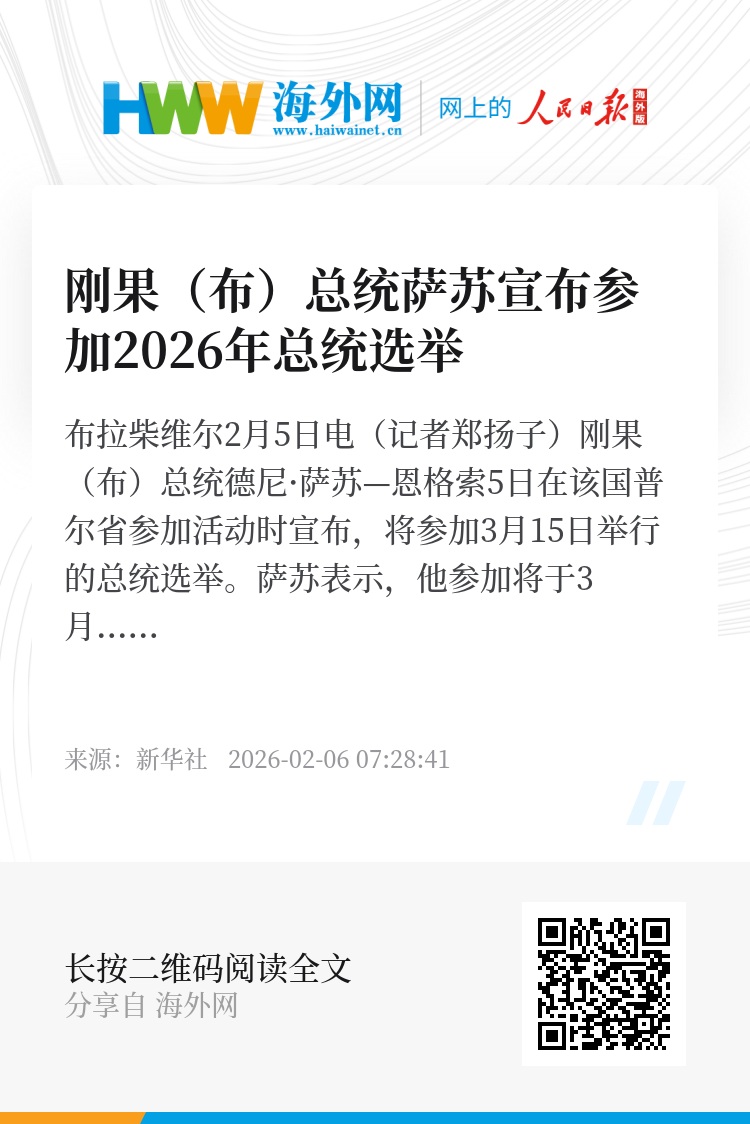 新华社布拉柴维尔2月5日电(记者郑扬子)刚果(布)总统德尼·萨苏—恩格索5日在该国普尔省参加活动时宣布,将参加3月15日举行的总统选举。