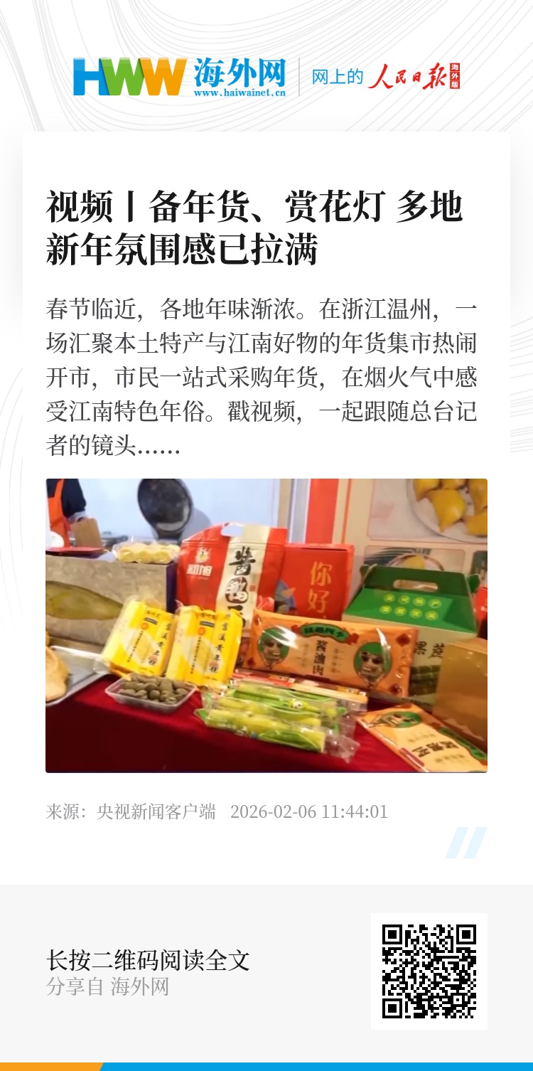 春节临近,各地年味渐浓。在浙江温州,一场汇聚本土特产与江南好物的年货集市热闹开市,市民一站式采购年货,在烟火气中感受江南特色年俗。戳视频,一起跟随总台记者的镜头去看看那里的年货都有哪些。