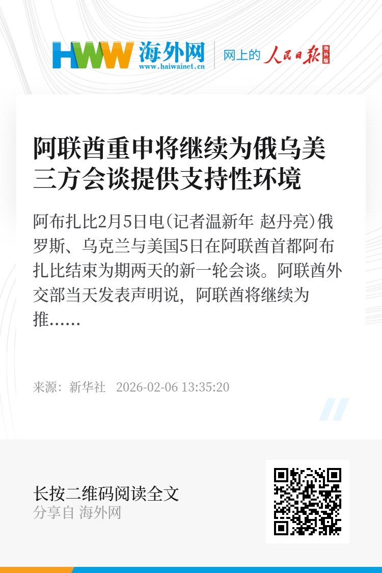 新华社阿布扎比2月5日电(记者温新年 赵丹亮)俄罗斯、乌克兰与美国5日在阿联酋首都阿布扎比结束为期两天的新一轮会谈。阿联酋外交部当天发表声明说,阿联酋将继续为推进俄乌冲突和平解决方案提供支持性环境,支持一切旨在实现全面政治解决的努力。