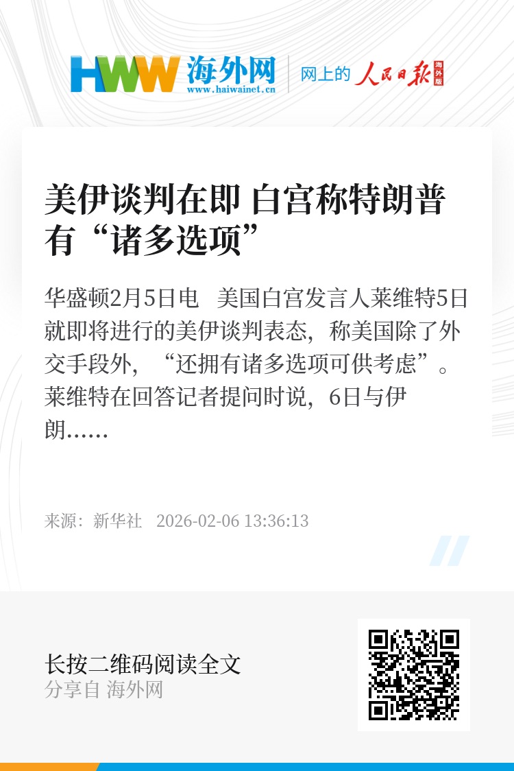 新华社华盛顿2月5日电 美国白宫发言人莱维特5日就即将进行的美伊谈判表态,称美国除了外交手段外,“还拥有诸多选项可供考虑”。