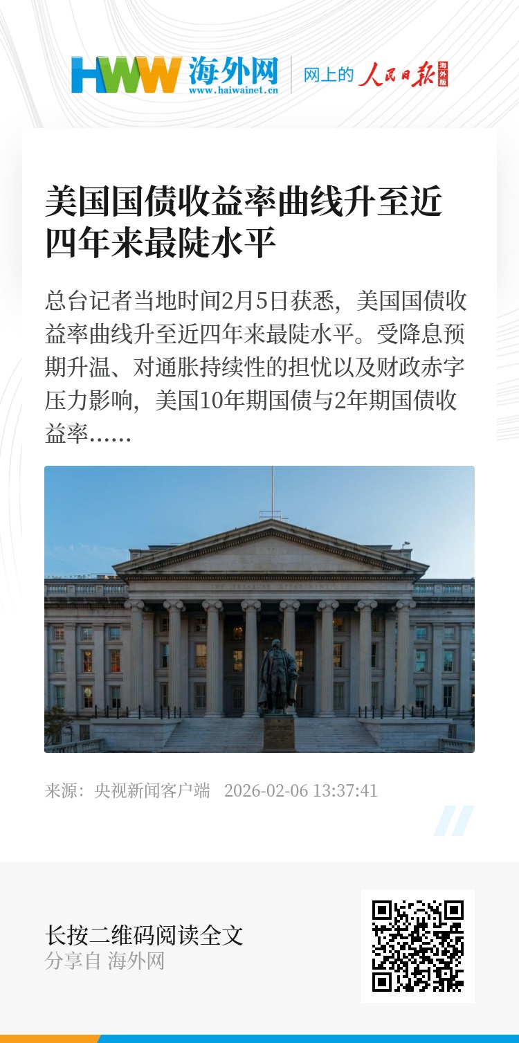 总台记者当地时间2月5日获悉,美国国债收益率曲线升至近四年来最陡水平。