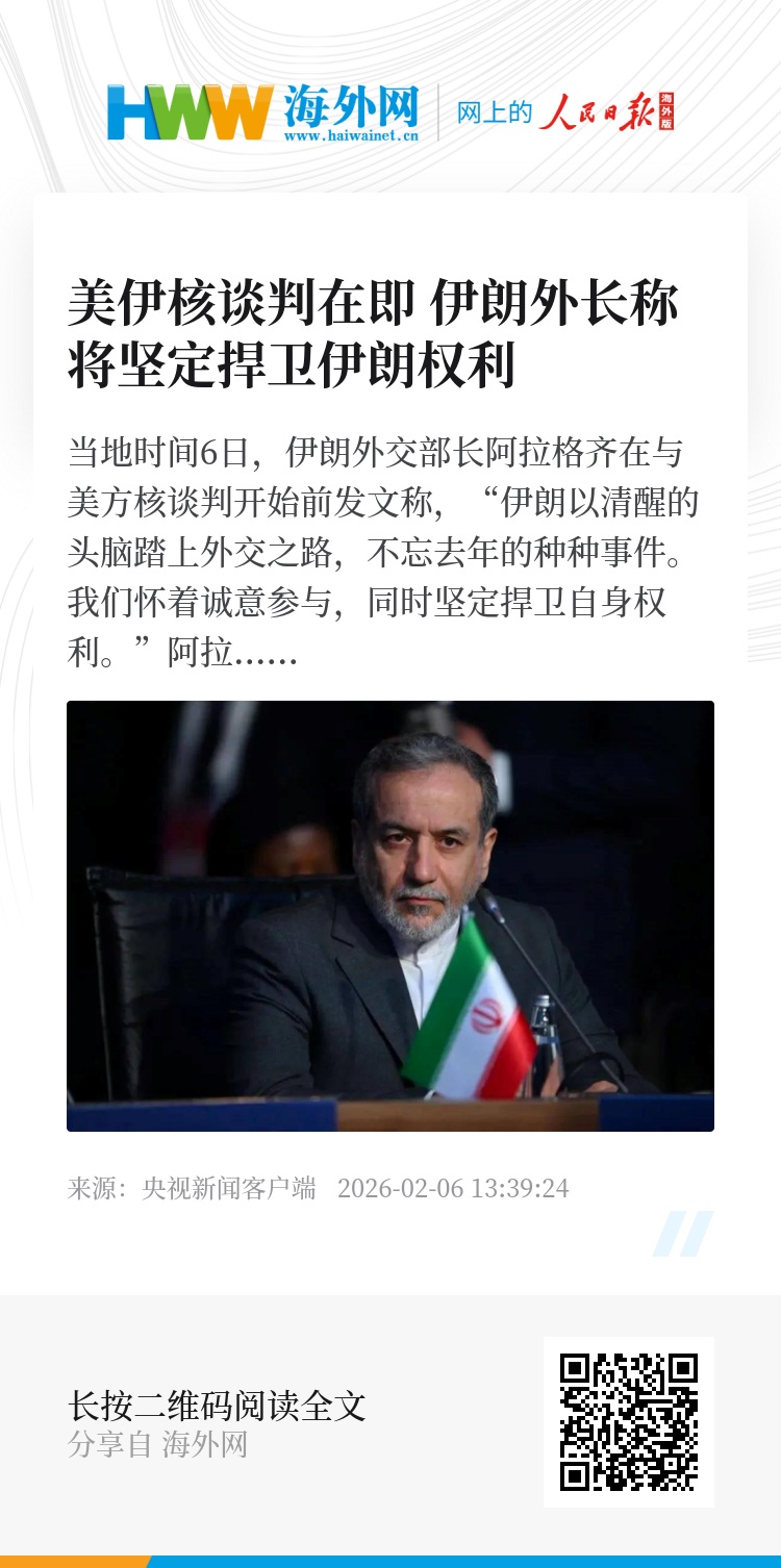 当地时间6日,伊朗外交部长阿拉格齐在与美方核谈判开始前发文称,“伊朗以清醒的头脑踏上外交之路,不忘去年的种种事件。我们怀着诚意参与,同时坚定捍卫自身权利。”