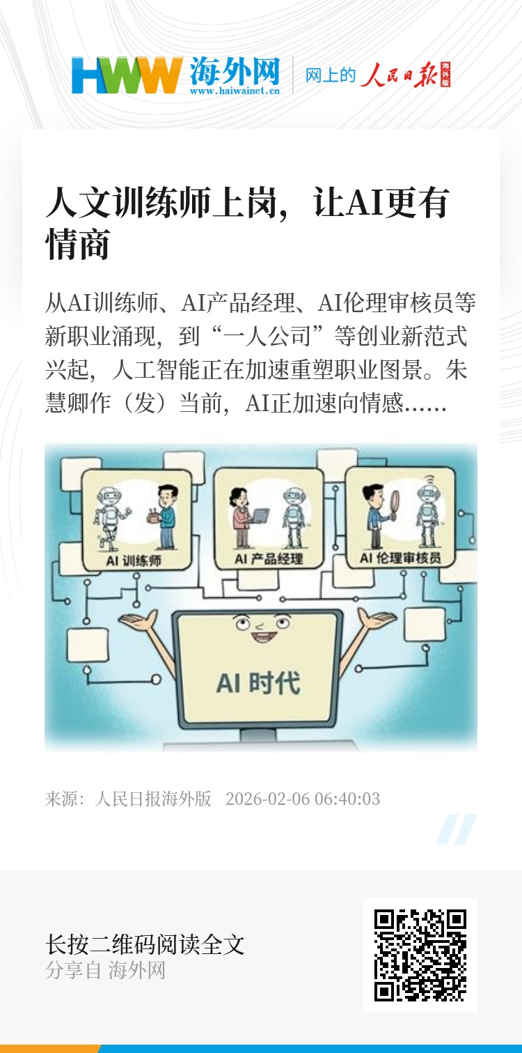 从AI训练师、AI产品经理、AI伦理审核员等新职业涌现,到“一人公司”等创业新范式兴起,人工智能正在加速重塑职业图景。