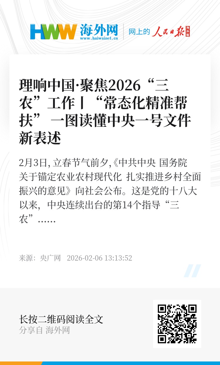2月3日,立春节气前夕,《中共中央 国务院关于锚定农业农村现代化 扎实推进乡村全面振兴的意见》向社会公布。这是党的十八大以来,中央连续出台的第14个指导“三农”工作的一号文件,也是“十五五”时期的首个中央一号文件。今年中央一号文件首次提出实施“常态化精准帮扶”,并对此作出系统性部署。如何理解“常态化”?怎样把“精准帮扶”落到实处?央广网约请相关专家进行解读。