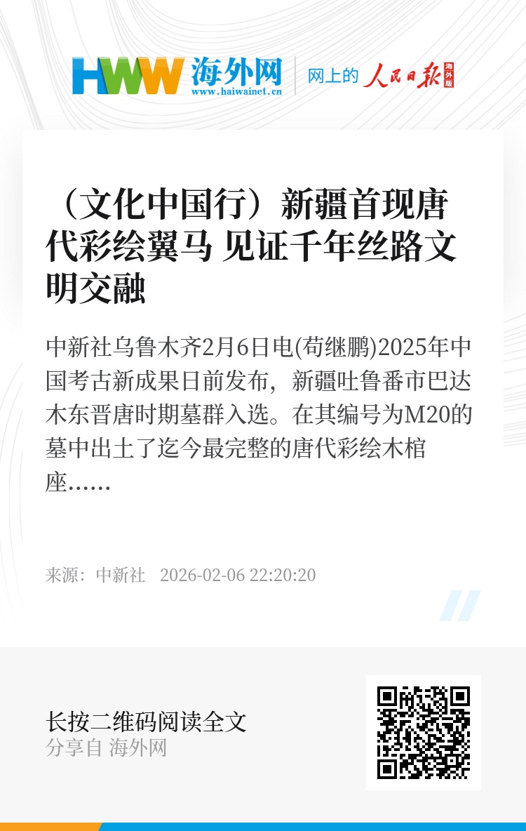 中新社乌鲁木齐2月6日电(苟继鹏)2025年中国考古新成果日前发布,新疆吐鲁番市巴达木东晋唐时期墓群入选。在其编号为M20的墓中出土了迄今最完整的唐代彩绘木棺座,上面有两匹彩绘翼马(带翅膀的马),系新疆首次发现,颇受关注。