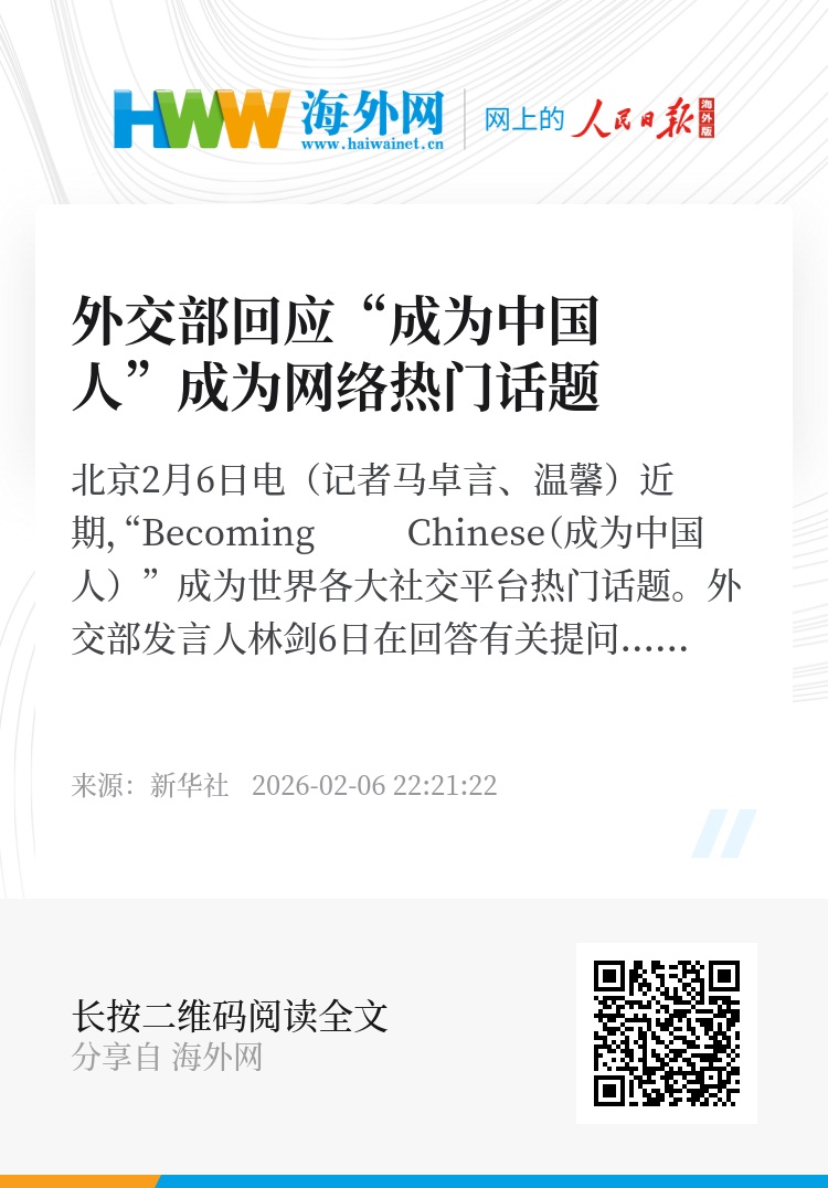 新华社北京2月6日电(记者马卓言、温馨)近期,“Becoming Chinese(成为中国人)”成为世界各大社交平台热门话题。外交部发言人林剑6日在回答有关提问时表示,历史与现代、传统与时尚的混搭组合,带来了独一无二的新奇感受,使中国作为全球旅游目的地的吸引力持续增强,各国民众对中国的好感度不断攀高。热忱欢迎外国朋友来中国过春节。