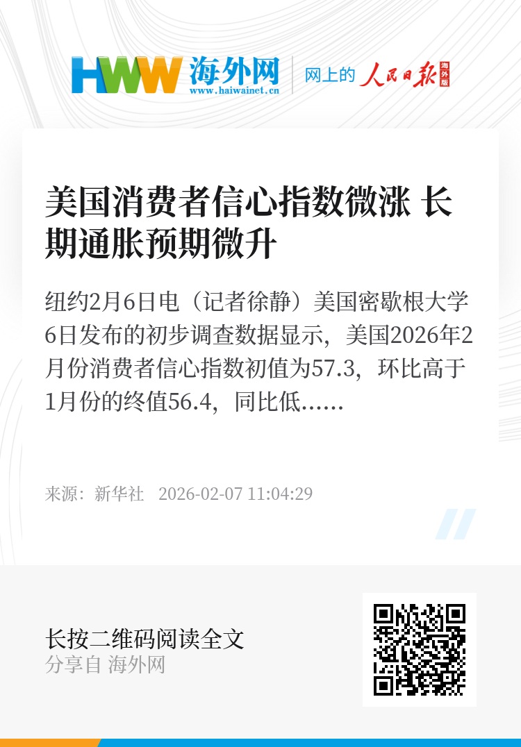 新华社纽约2月6日电(记者徐静)美国密歇根大学6日发布的初步调查数据显示,美国2026年2月份消费者信心指数初值为57.3,环比高于1月份的终值56.4,同比低于2025年2月份的终值64.7。
