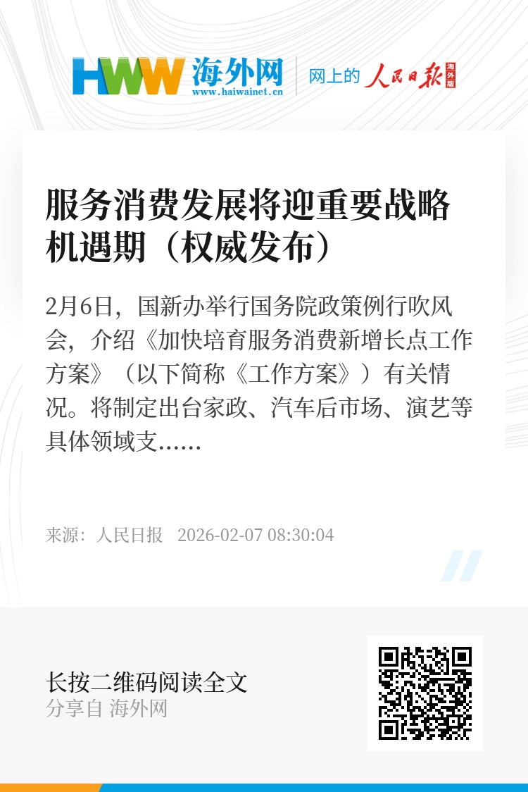 2月6日,国新办举行国务院政策例行吹风会,介绍《加快培育服务消费新增长点工作方案》(以下简称《工作方案》)有关情况。