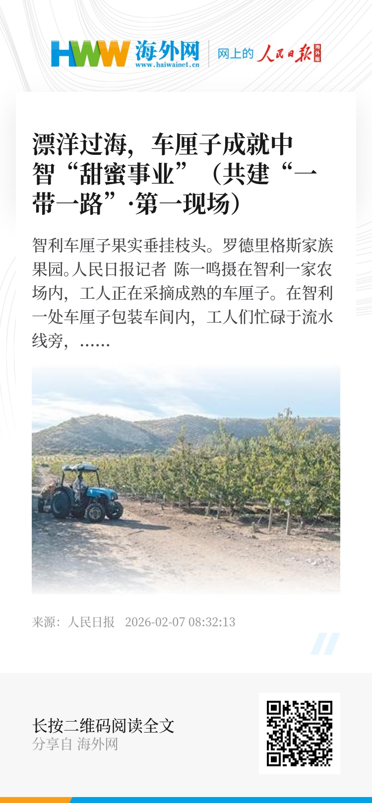 夕阳下,罗德里格斯站在果园高处,目送又一批满载车厘子的冷链货车驶上5号公路,奔赴大洋彼岸的中国。“这是一个双向奔赴的故事。过去,我们只想着把果子种好。现在,我们知道自己在参与一项意义深远的事业——用一颗颗甜美的果实,连接起两个相距遥远的国度。”他说,“这条‘甜蜜之路’,我们会一直坚定地走下去。”