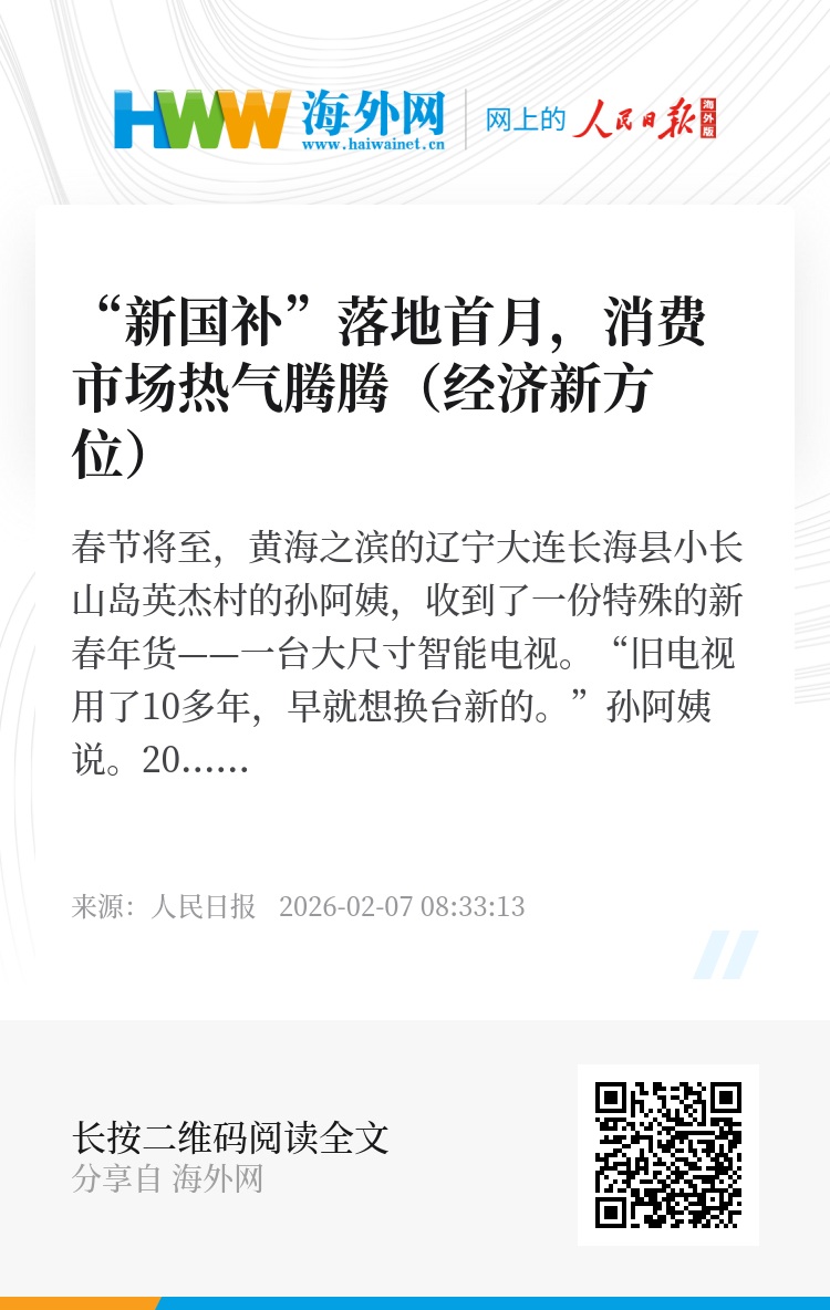 新年伊始,消费市场热力升腾,“新国补”成为“抢眼主角”。随着2026年以旧换新政策落地,多地家电和汽车卖场人气攀升,节能家电、智能家电、新能源汽车等升级款产品,成了抢手的“香饽饽”。1月1日至2日,河北省家电、数码和智能产品合计销售13.36万笔,销售总额5.9亿元;元旦假期,福建省福州市消费品(不含汽车)以旧换新核销近1600万元,拉动消费1.25亿元……政策红利对接消费需求,新年扩内需、促消费的“开场好戏”拉开大幕。