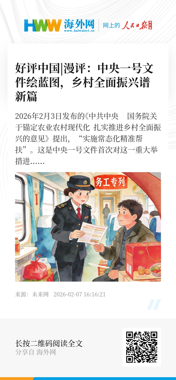 “实施常态化精准帮扶”,守护的是来之不易的脱贫攻坚成果,点燃的是亿万农民对更美好生活的向往,夯实的是中国式现代化行稳致远的根基。期待在2026年中央一号文件的指引下,各地各部门凝心聚力、久久为功,以常态化精准帮扶的扎实成效,持续巩固拓展脱贫攻坚成果,把农业建成现代化大产业、使农村基本具备现代生活条件、让农民生活更加富裕美好!(文字:魏平、刘畅、王平;AI漫画:唐芝柏)