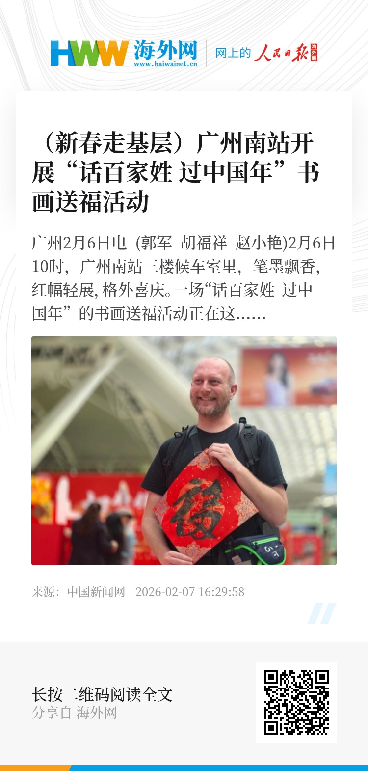 中新网广州2月6日电 (郭军 胡福祥 赵小艳)2月6日10时,广州南站三楼候车室里,笔墨飘香,红幅轻展,格外喜庆。一场“话百家姓 过中国年”的书画送福活动正在这里火热上演,给旅客送上一份特别的年味。