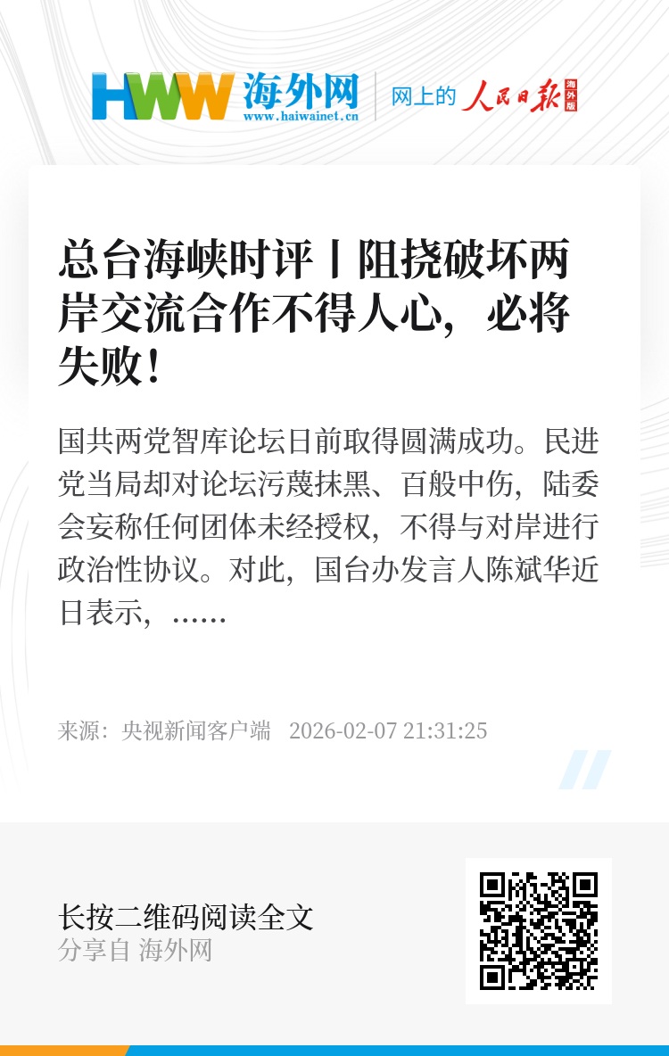 “两岸一家亲”,热络交流、互利共赢本就是两岸间该有的图景,民进党当局横加阻挠只会搬石砸脚。随着两岸民间持续加强交流合作,保持良性互动,两岸同胞将携手开创优势互补、融合发展的新局面。特别是“十五五”时期,中国式现代化建设必将为两岸同胞打开更加广阔的交流合作空间,吸引台胞扎根大陆,实现更好发展。当两岸和平发展、融合发展的红利惠及更广大岛内民众,民进党当局禁限两岸往来的图谋将更快失败,其“抗中反中脱中”的话术必然彻底失效。