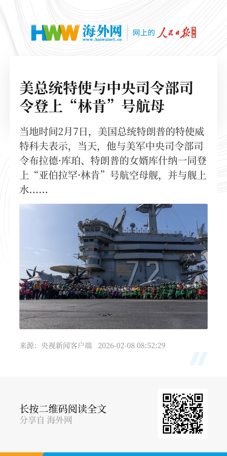 当地时间2月7日,美国总统特朗普的特使威特科夫表示,当天,他与美军中央司令部司令布拉德·库珀、特朗普的女婿库什纳一同登上“亚伯拉罕·林肯”号航空母舰,并与舰上水兵和海军陆战队员会面。