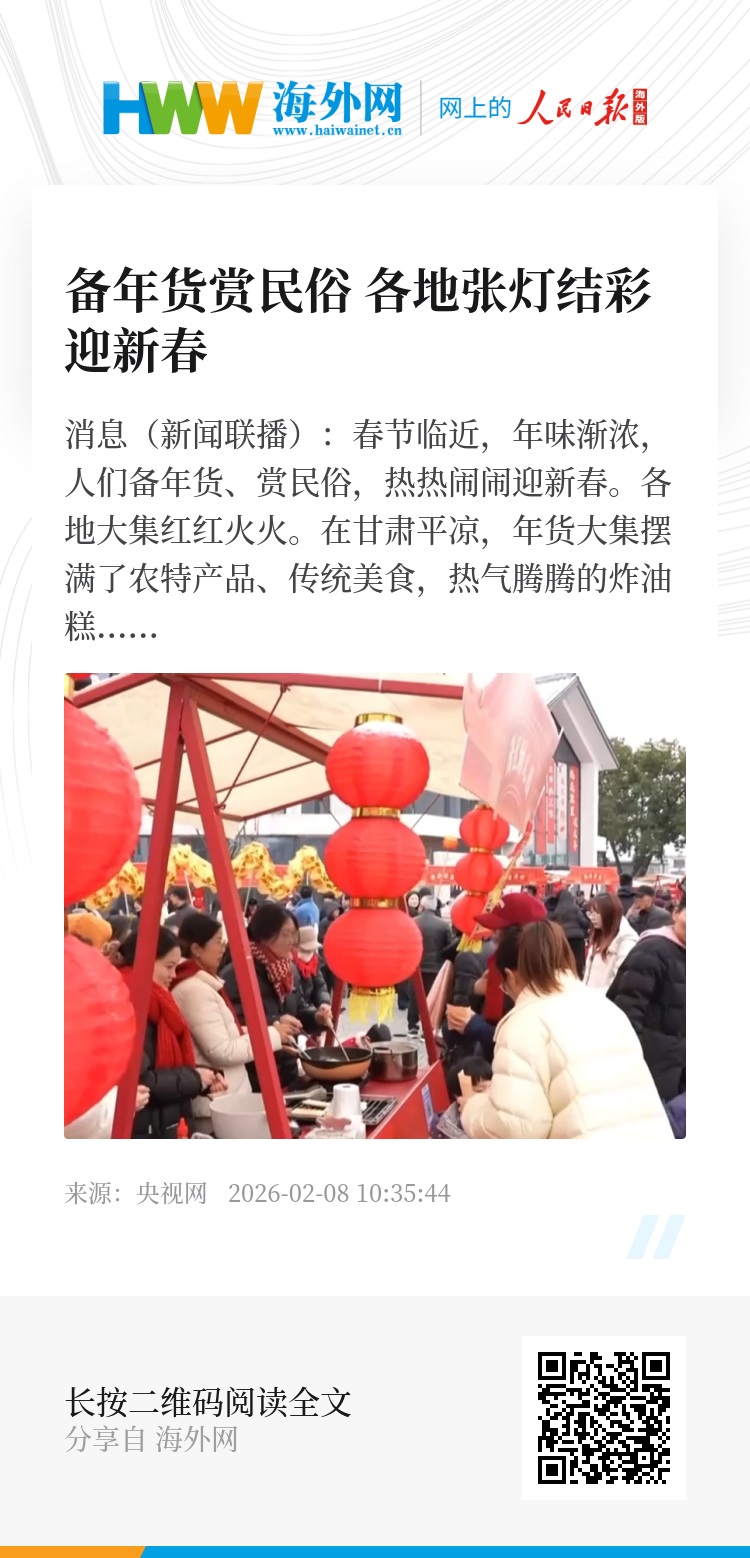 各地大集红红火火。在甘肃平凉,年货大集摆满了农特产品、传统美食,热气腾腾的炸油糕、炸麻花,寓意节节高升、幸福长远,让人们在烟火中感受浓浓的年味;在辽宁沈阳,上水泉大集上400多家摊位次第铺开,新鲜水果、家禽活鱼、糕点糖果……品类丰富;在江苏无锡,江南特色市集上,软糯糕团、青鱼丸子等传统小吃香气四溢,让年的味道藏在味蕾里。