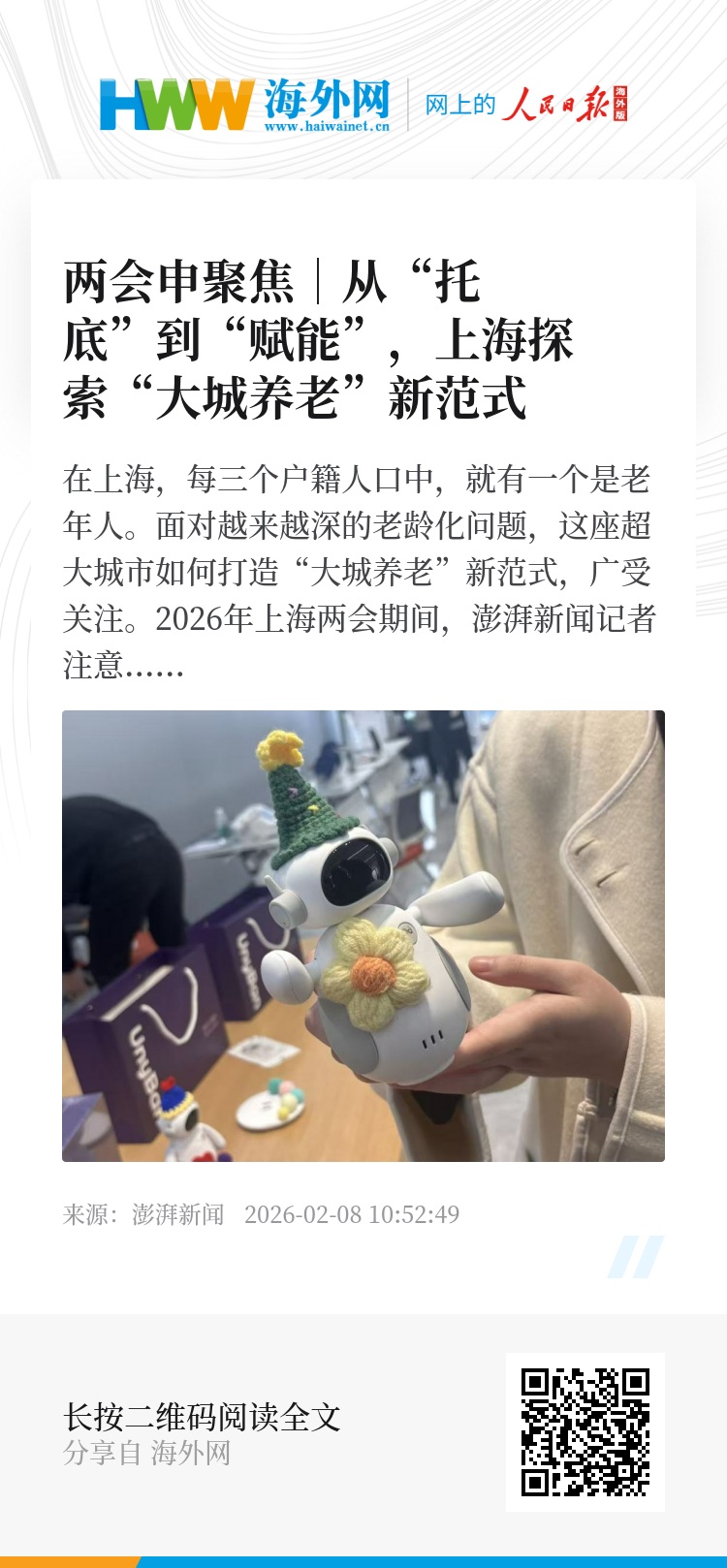 2026年上海两会期间,澎湃新闻记者注意到,老年人的福祉仍然是代表委员们关注的焦点,失能老人如何被托底?独身老人的“身后事”如何被守护?老年人越来越细分的需求如何被满足?