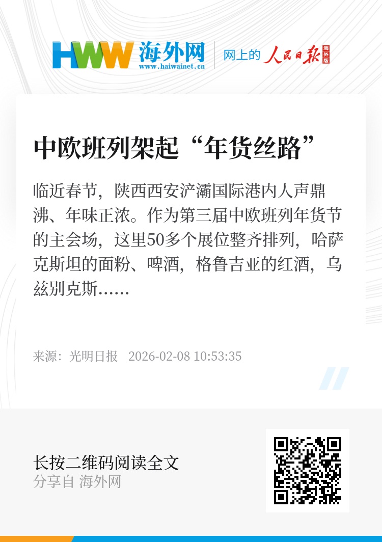 “当前,中欧班列已成为高质量共建‘一带一路’的务实合作载体和广受欢迎的国际公共产品,为保障国际供应链稳定畅通、促进亚欧繁荣和可持续发展作出了重要贡献。”国铁集团货运部负责人表示,春节将近,中欧班列犹如“年货丝路”,满载全球佳肴走进中国家庭,也带着中国年味与文化抵达远方。(光明日报记者 訾谦)