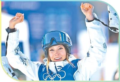 自由式滑雪女子坡面障碍技巧资格赛中,中国队选手谷爱凌在试跳后庆祝。
