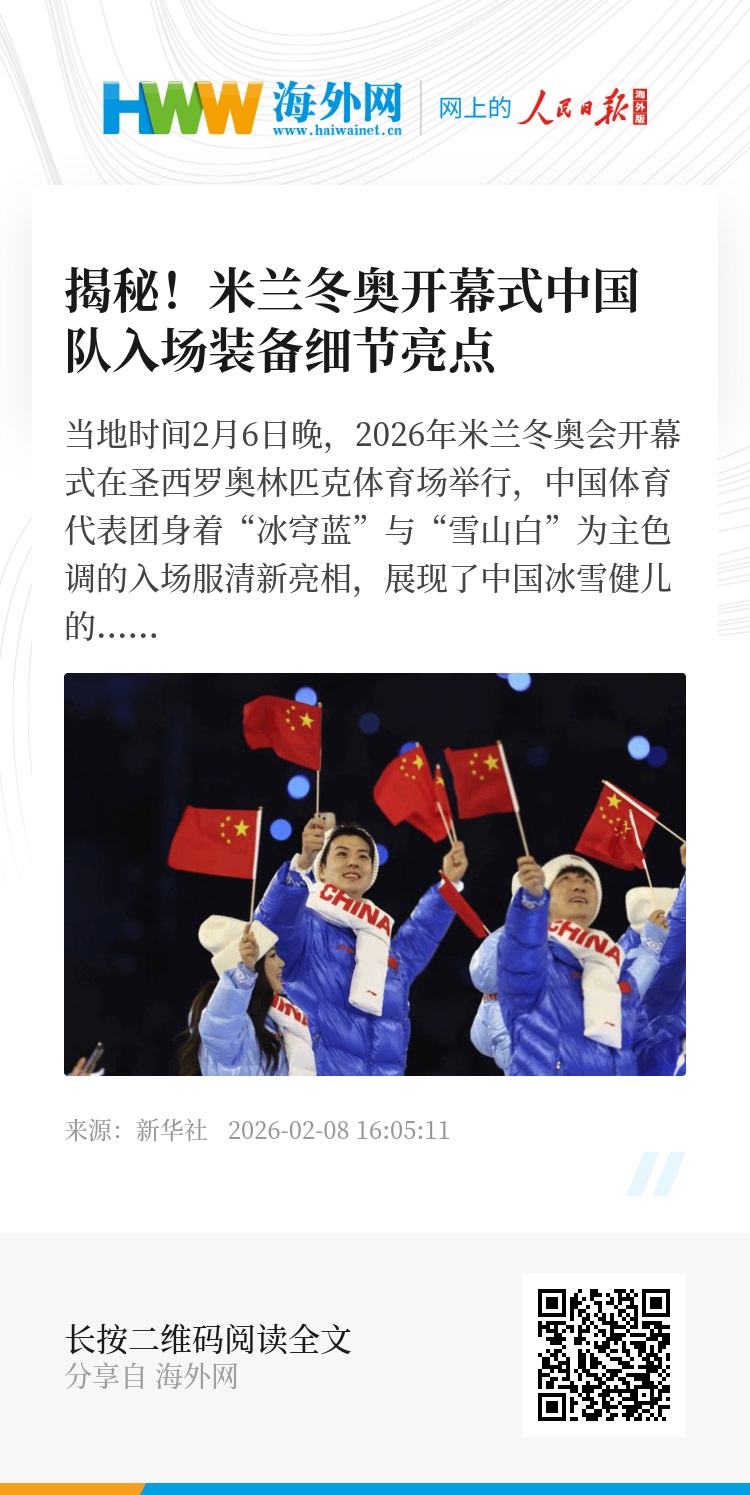 当地时间2月6日晚,2026年米兰冬奥会开幕式在圣西罗奥林匹克体育场举行,中国体育代表团身着“冰穹蓝”与“雪山白”为主色调的入场服清新亮相,展现了中国冰雪健儿的精神风貌与中国运动装备的研发实力。