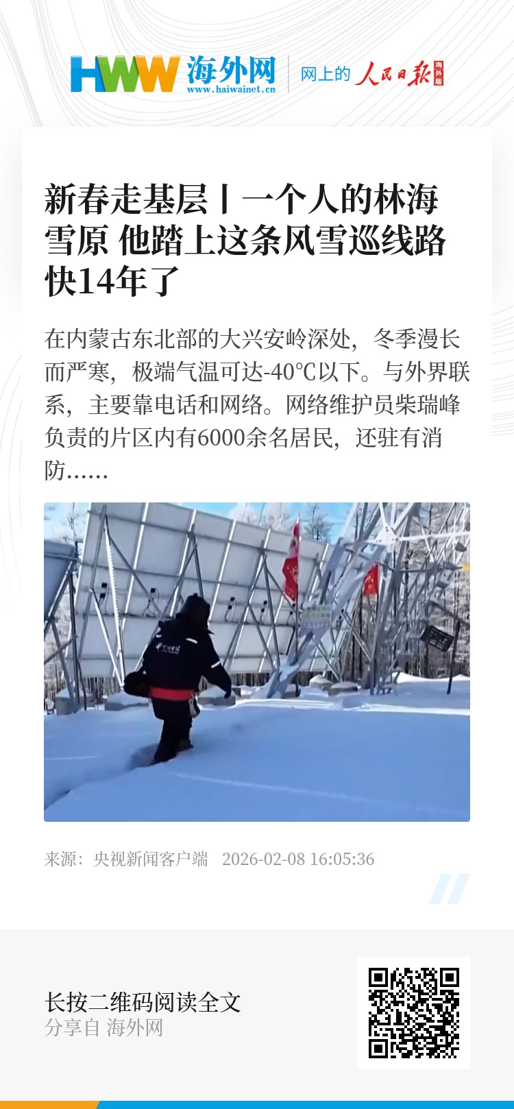 在内蒙古东北部的大兴安岭深处,冬季漫长而严寒,极端气温可达-40℃以下。与外界联系,主要靠电话和网络。网络维护员柴瑞峰负责的片区内有6000余名居民,还驻有消防救援机动队伍和森林资源管护站。近14年来,他独自踏遍了1.3万平方公里的林海雪原,守护着106个基站、50多个瞭望塔以及800多公里的光缆。日前,总台新春走基层记者跟随他走进林海,记录下了极寒环境中一个人一台车的风雪巡线路。