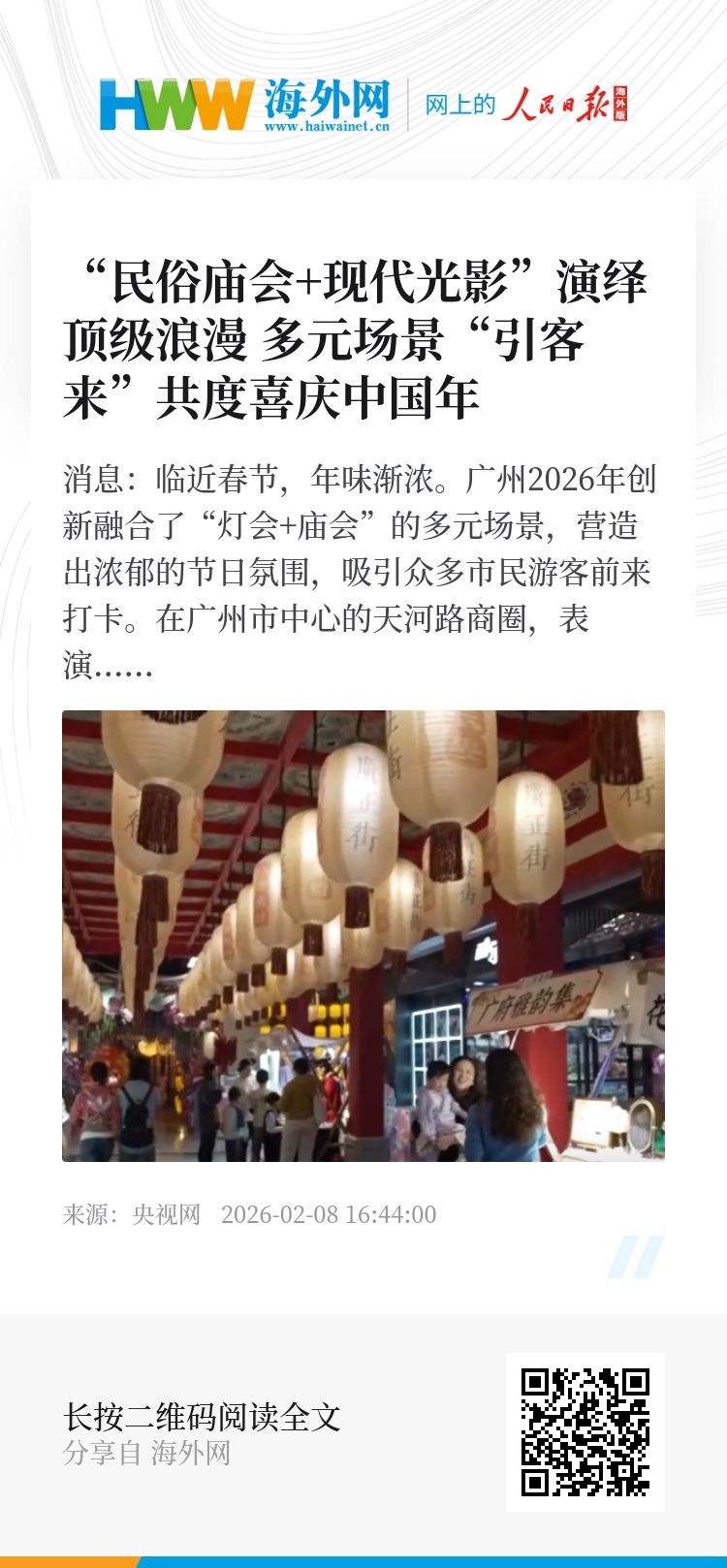 央视网消息:临近春节,年味渐浓。广州2026年创新融合了“灯会+庙会”的多元场景,营造出浓郁的节日氛围,吸引众多市民游客前来打卡。