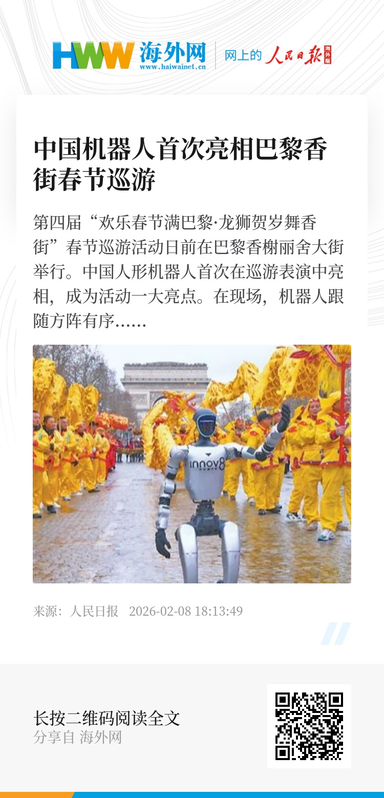 第四届“欢乐春节满巴黎·龙狮贺岁舞香街”春节巡游活动日前在巴黎香榭丽舍大街举行。中国人形机器人首次在巡游表演中亮相,成为活动一大亮点。