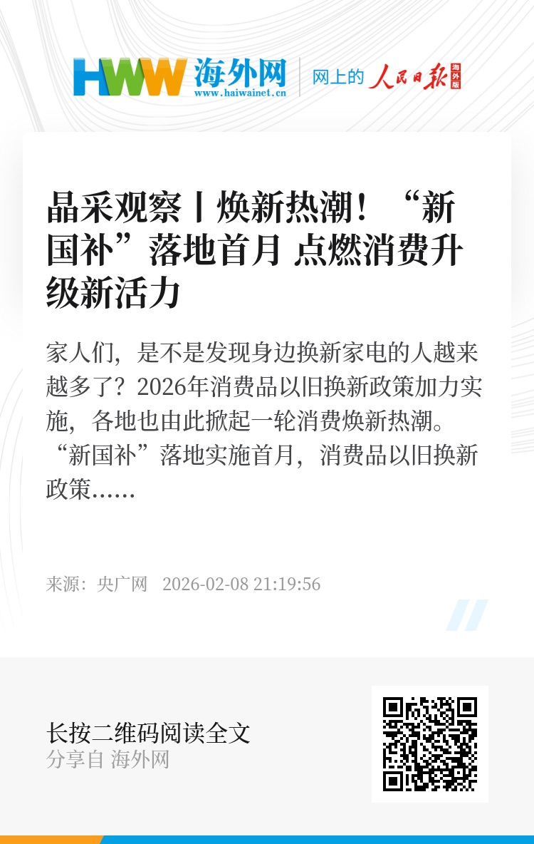 总的来说,“新国补”首月的热度,离不开春节旺季的助推。春节要添新、要体面,换的是家里的旧物件,是春节回家的底气,提升的是我们的生活品质,这股火热的消费势头,更成为我国经济稳步向好、消费活力持续释放的鲜明信号。