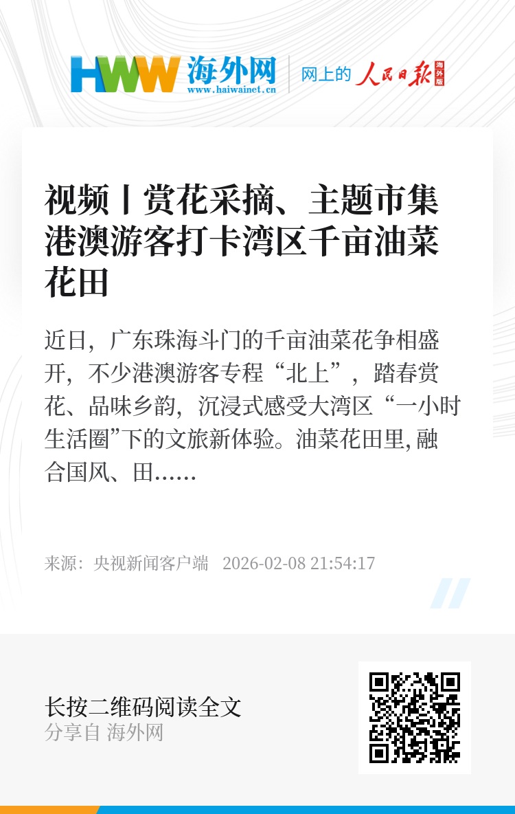 近日,广东珠海斗门的千亩油菜花争相盛开,不少港澳游客专程“北上”,踏春赏花、品味乡韵,沉浸式感受大湾区“一小时生活圈”下的文旅新体验。