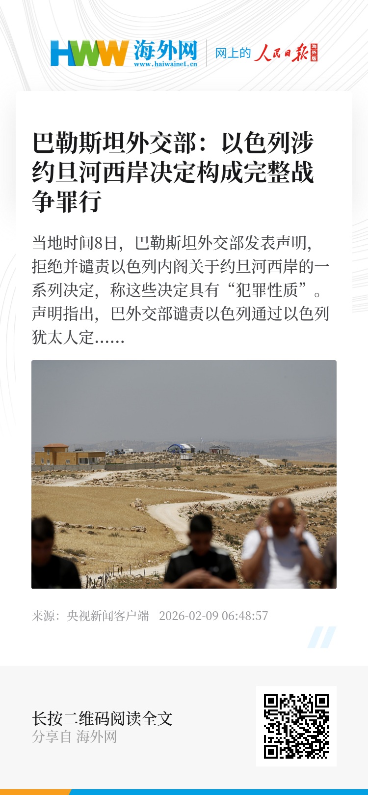 巴勒斯坦外交部表示,这些决定构成完整的战争罪行。声明呼吁各国和国际机构拒绝并谴责这一罪行,并对以方相关机构所犯下的战争罪行展开刑事调查。(总台记者 赵兵)