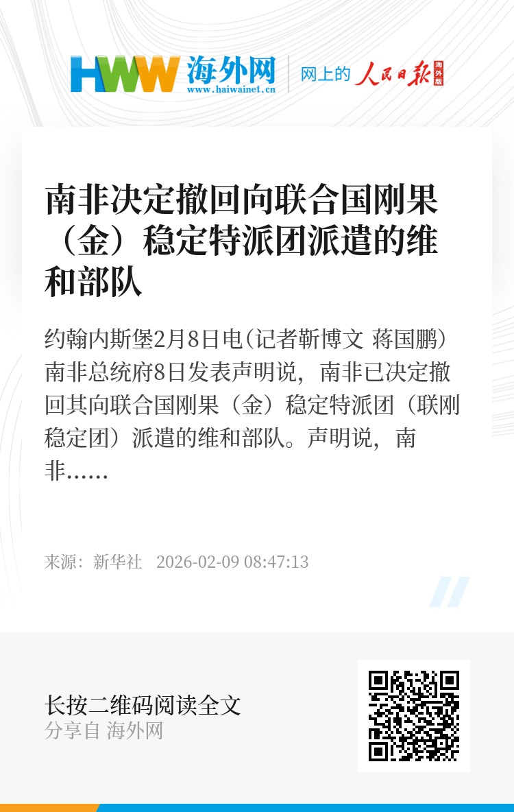 新华社约翰内斯堡2月8日电(记者靳博文 蒋国鹏)南非总统府8日发表声明说,南非已决定撤回其向联合国刚果(金)稳定特派团(联刚稳定团)派遣的维和部队。