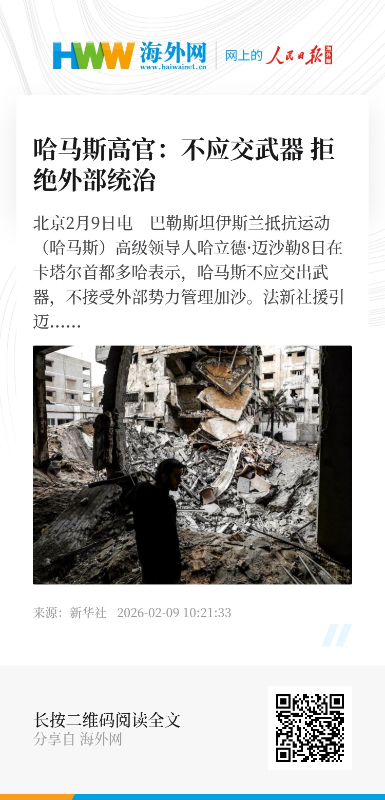 新华社北京2月9日电 巴勒斯坦伊斯兰抵抗运动(哈马斯)高级领导人哈立德·迈沙勒8日在卡塔尔首都多哈表示,哈马斯不应交出武器,不接受外部势力管理加沙。