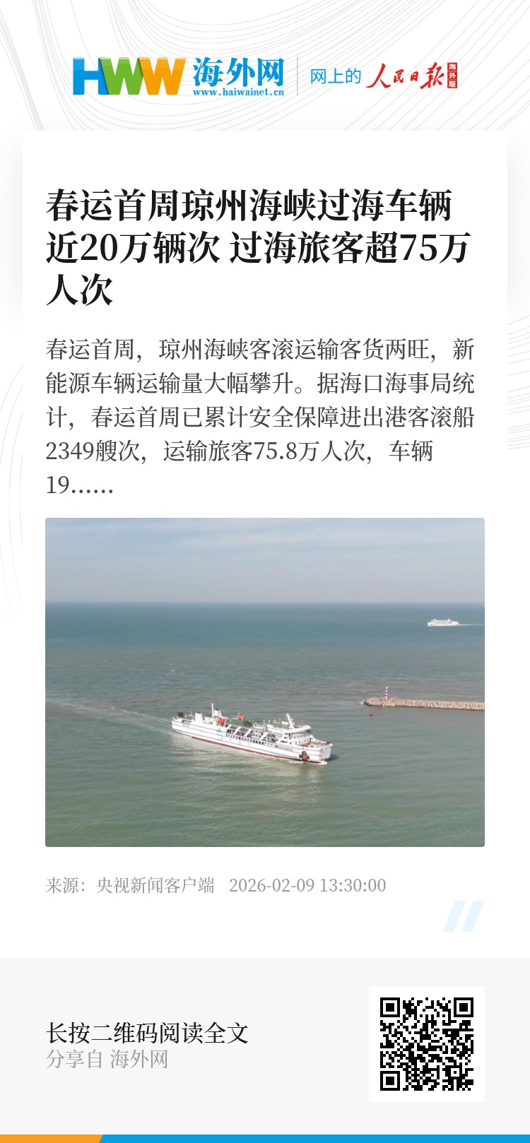春运首周,琼州海峡客滚运输客货两旺,新能源车辆运输量大幅攀升。据海口海事局统计,春运首周已累计安全保障进出港客滚船2349艘次,运输旅客75.8万人次,车辆19.27万辆次,同比分别增加4.58%、16.65%、9.30%。其中新能源车辆运输专班累计开行361艘次,同比增加75.24%。累计运输新能源车辆33670辆次,同比增加122.49%。