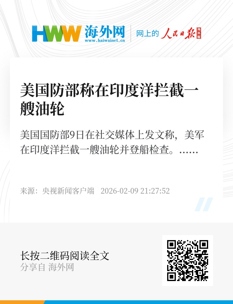 美国国防部9日在社交媒体上发文称,美军在印度洋拦截一艘油轮并登船检查。