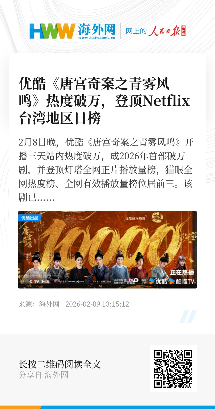 2月8日晚,优酷《唐宫奇案之青雾风鸣》开播三天站内热度破万,成2026年首部破万剧,并登顶灯塔全网正片播放量榜,猫眼全网热度榜、全网有效播放量榜位居前三。该剧已于Netflix全球同步播出,截至2月9日,该剧登顶台湾地区日榜,并位列新加坡、香港地区日榜第三。