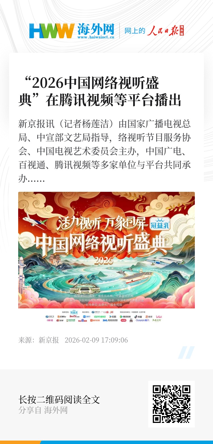 新京报讯(记者杨莲洁)由国家广播电视总局、中宣部文艺局指导,中国网络视听节目服务协会、中国电视艺术委员会主办,中国广电、百视通、腾讯视频等多家单位与平台共同承办的《“活力视听 万象同屏”2026中国网络视听盛典》于2月7日(腊月二十)在腾讯视频等多家平台上线播出。