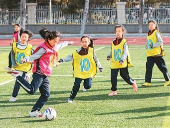 近年来,山东省荣成市大力推进青少年校园足球发展,促进学生身体与心理健康水平稳步提升。图为荣成市蜊江小学足球场上,小学生们正进行足球比赛。