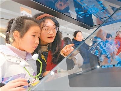 1月18日,安徽合肥兴园社区星火科技馆正式对外开放。图为社区工作人员在科技馆内通过全息呈现设备向青少年讲解人工智能技术在日常生活中的应用。