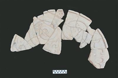 据龚湛清介绍,本次考古发掘出土器物中最有特色的一件当为“彩绘熊首泥塑”,宽约20厘米,长约25厘米,通过塑形、铺设彩色石块、涂刷白灰地仗层、彩绘等步骤制成。中国社会科学院科技考古与文化遗产保护重点实验室对其开展了曲面荧光扫描,发现了钙、铁、锰、钛等化学元素,表明其表面彩绘可能由白、红、黑等颜色构成,其制作工艺、结构、彩绘方法与辽宁牛河梁女神庙内出土壁画相似。