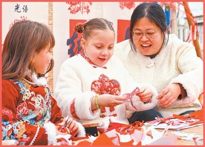 1月24日,安徽黄山市屯溪区南溪南村,外国小朋友体验非遗剪纸。施亚磊摄(人民视觉)