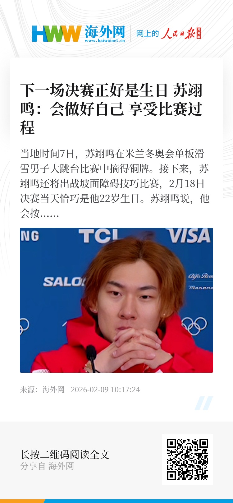 当地时间7日,苏翊鸣在米兰冬奥会单板滑雪男子大跳台比赛中摘得铜牌。接下来,苏翊鸣还将出战坡面障碍技巧比赛,2月18日决赛当天恰巧是他22岁生日。苏翊鸣说,他会按照计划进行每天的训练,一步一步、踏踏实实地做好自己,以信心迎接后续比赛,享受比赛过程。(记者 刘峣)