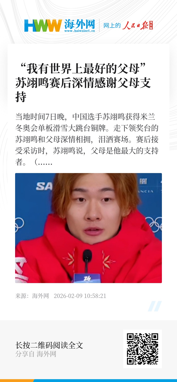 当地时间7日晚,中国选手苏翊鸣获得米兰冬奥会单板滑雪大跳台铜牌。走下领奖台的苏翊鸣和父母深情相拥,泪洒赛场。赛后接受采访时,苏翊鸣说,父母是他最大的支持者。(记者 刘峣)