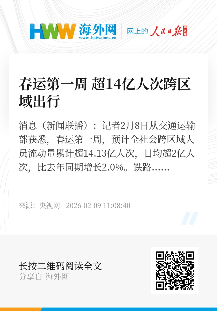 央视网消息(新闻联播):记者2月8日从交通运输部获悉,春运第一周,预计全社会跨区域人员流动量累计超14.13亿人次,日均超2亿人次,比去年同期增长2.0%。