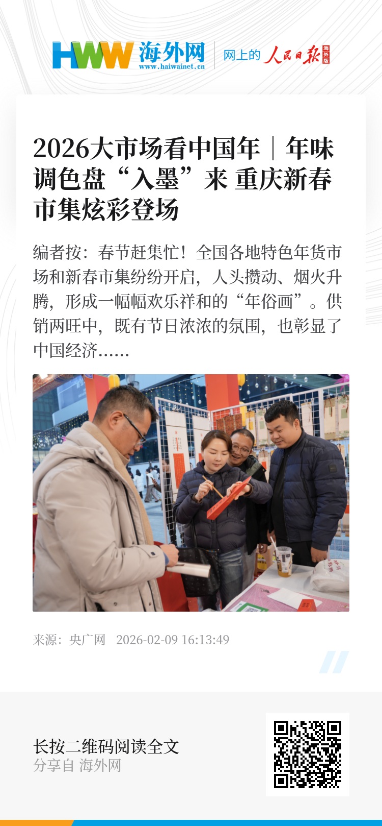 除了沉浸式感受新春氛围,年货的购买方式也顺应数字时代实现升级。在观音桥巴渝“土特产”年货季的市集现场,各展台下方的海报上均印有二维码,市民和游客扫码即可线上选购心仪的土特产,足不出户便能享受地道的巴渝年味。