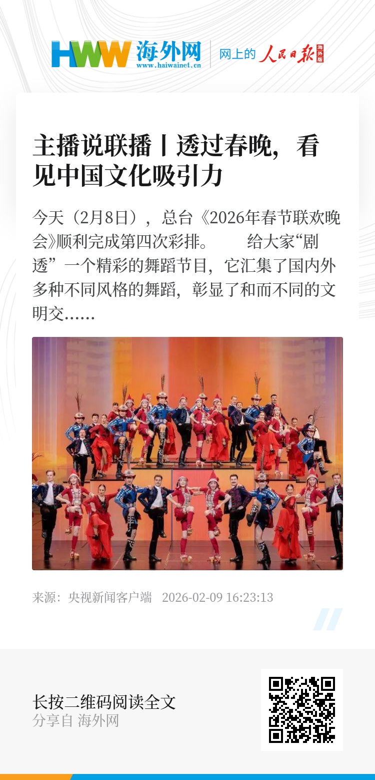 我们诚挚欢迎外国朋友来中国过春节。而春晚作为讲述中国故事、促进文化交流的重要舞台,更会不断精益求精,为全球华人和海外朋友奉上一道文化大餐。