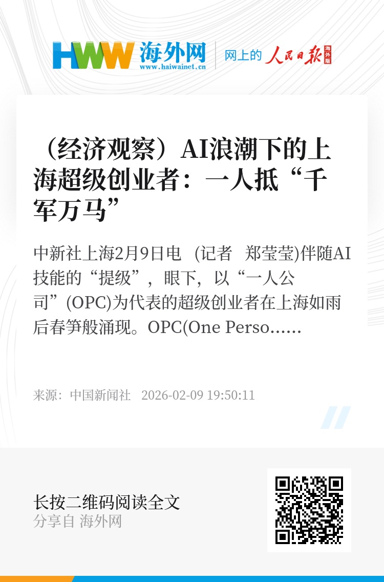 中新社上海2月9日电 (记者 郑莹莹)伴随AI技能的“提级”,眼下,以“一人公司”(OPC)为代表的超级创业者在上海如雨后春笋般涌现。