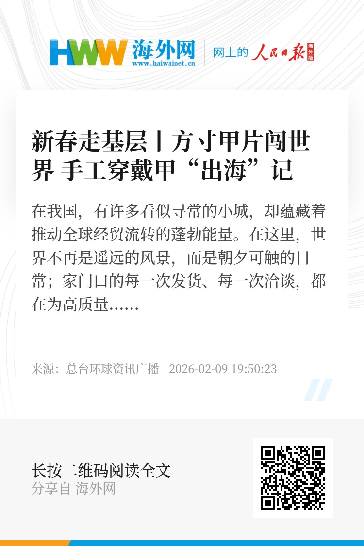 在我国,有许多看似寻常的小城,却蕴藏着推动全球经贸流转的蓬勃能量。在这里,世界不再是遥远的风景,而是朝夕可触的日常;家门口的每一次发货、每一次洽谈,都在为高质量发展写下生动的注脚。环球资讯广播2026新春走基层特别策划《家门口的世界》,继续聆听小城与世界握手的动人故事。