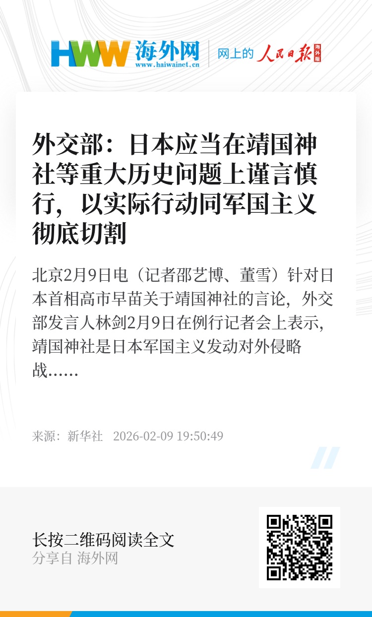新华社北京2月9日电(记者邵艺博、董雪)针对日本首相高市早苗关于靖国神社的言论,外交部发言人林剑2月9日在例行记者会上表示,靖国神社是日本军国主义发动对外侵略战争的精神工具和象征,供奉着对侵略战争负有严重罪责的14名甲级战犯。靖国神社问题的实质是日本能否正确认识和深刻反省日本军国主义侵略历史,事关人类良知、中日关系政治基础和日本的国家信誉。