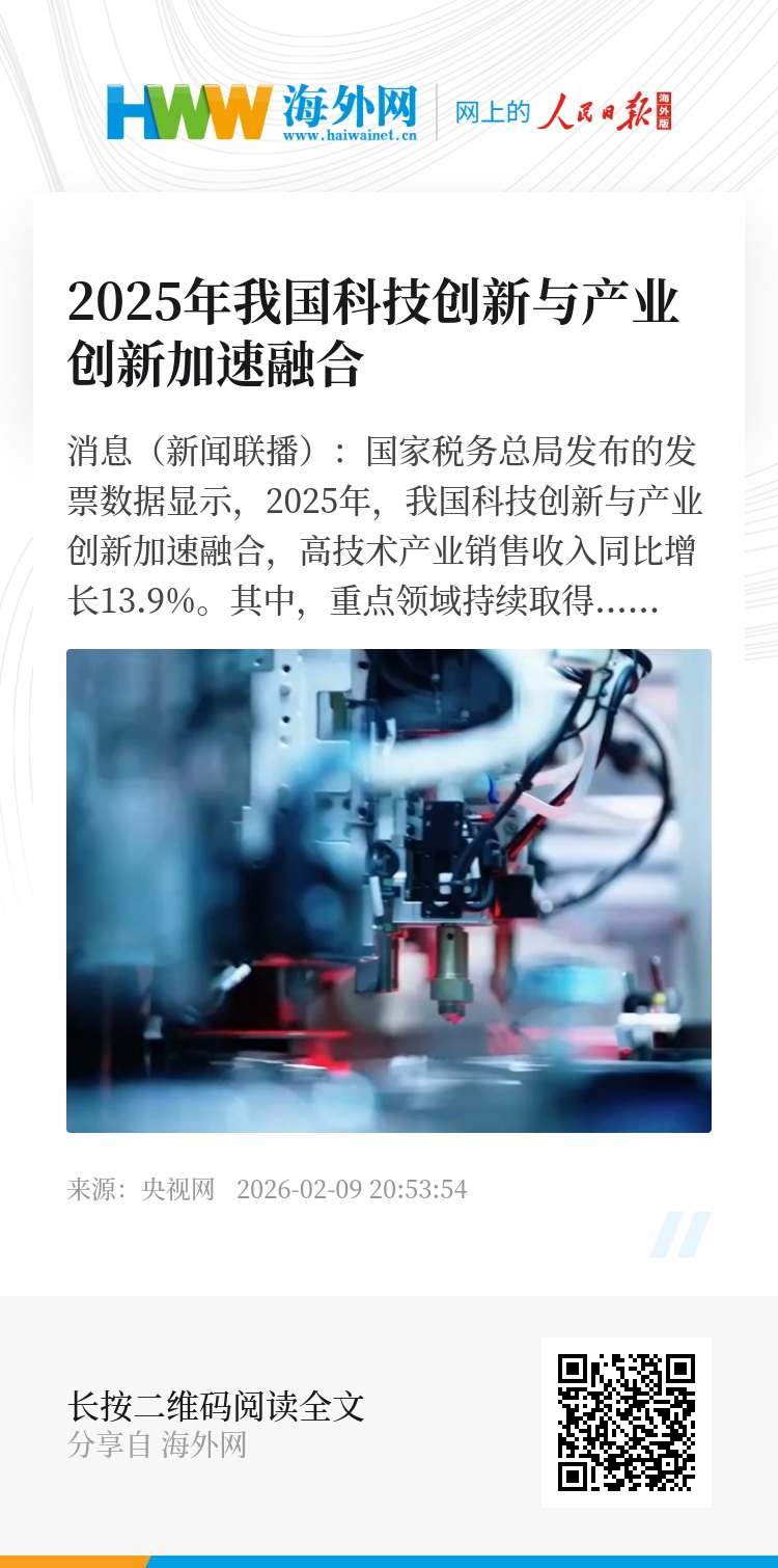 央视网消息(新闻联播):国家税务总局发布的发票数据显示,2025年,我国科技创新与产业创新加速融合,高技术产业销售收入同比增长13.9%。其中,重点领域持续取得突破,锂离子电池、集成电路、生物药品制造业销售收入分别增长25.1%、19.2%和7.7%。特别是“人工智能+”加快落地,消费机器人制造业销售收入同比增长超60%。