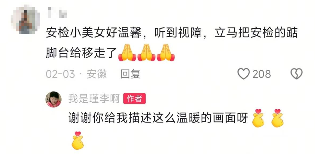 “我当时只是感觉被引导着站在平地上完成安检,后来从网友留言才知道,是安检员姐姐默默把安检台挪开了。”李怡瑾回忆道。