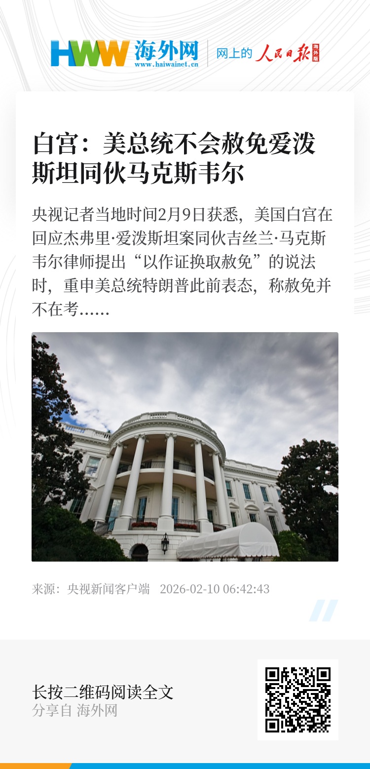 央视记者当地时间2月9日获悉,美国白宫在回应杰弗里·爱泼斯坦案同伙吉丝兰·马克斯韦尔律师提出“以作证换取赦免”的说法时,重申美总统特朗普此前表态,称赦免并不在考虑范围内。